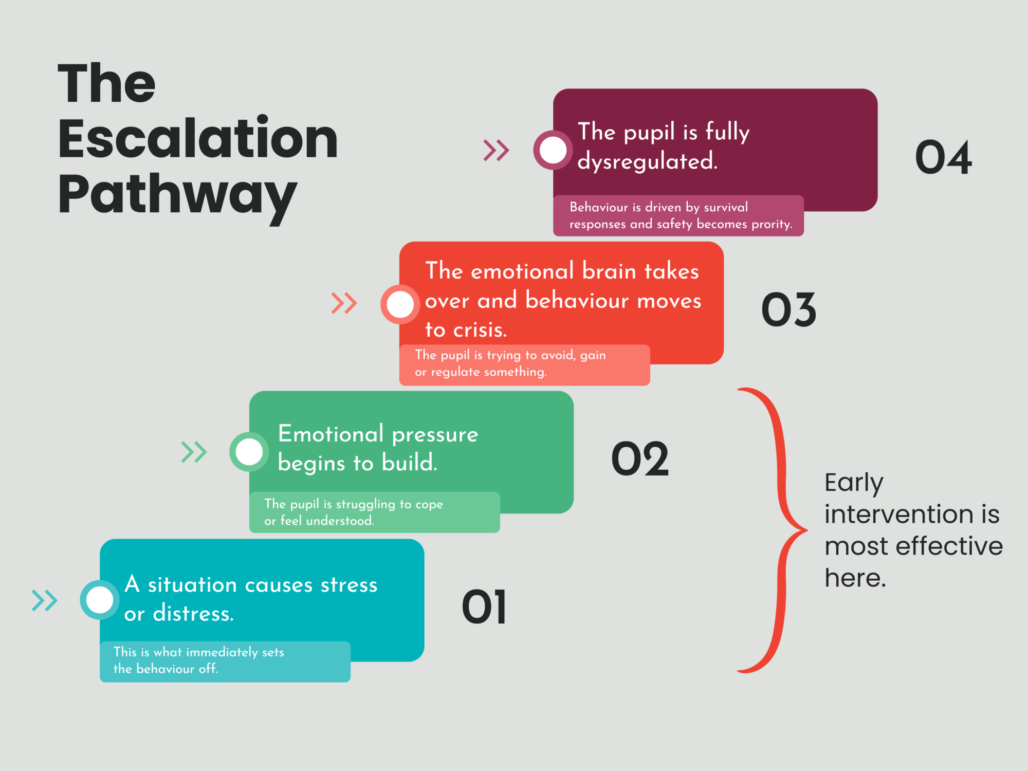 Early intervention focuses on responding during the frustration stage, when behaviour is still manageable and communication remains effective.