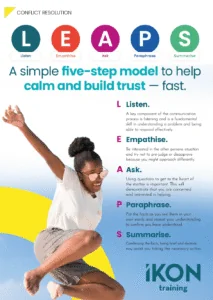 When reflecting on LEAPS as a tool for resolving conflict, I invite learners to offer examples of when they might have used LEAPS, and to revisit previous incidents where the use of LEAPS could have led to a preferable outcome. Usually, some interesting insights into people’s experiences alongside positive reinforcement reflect LEAPS as a simple but influential model.
